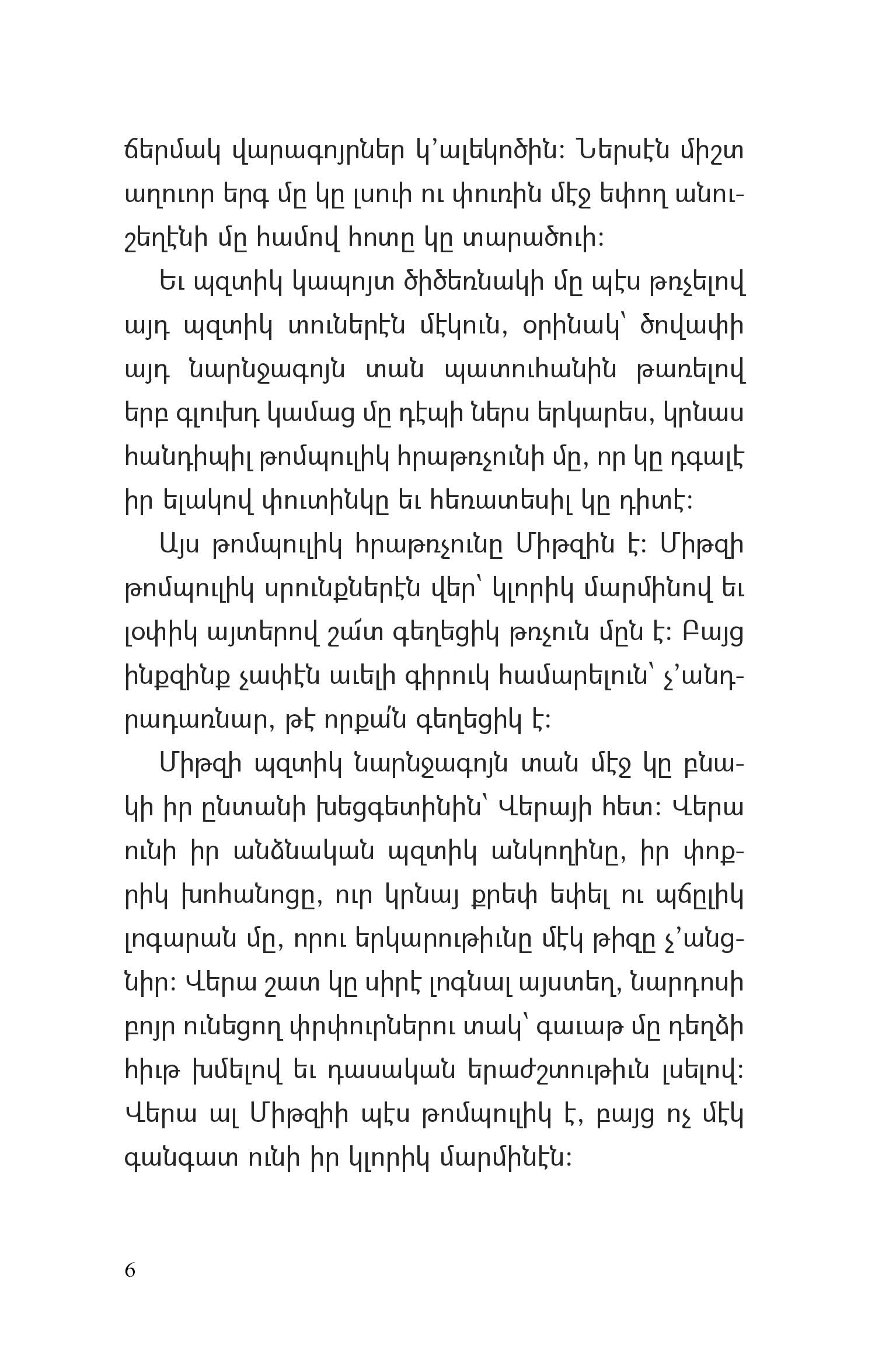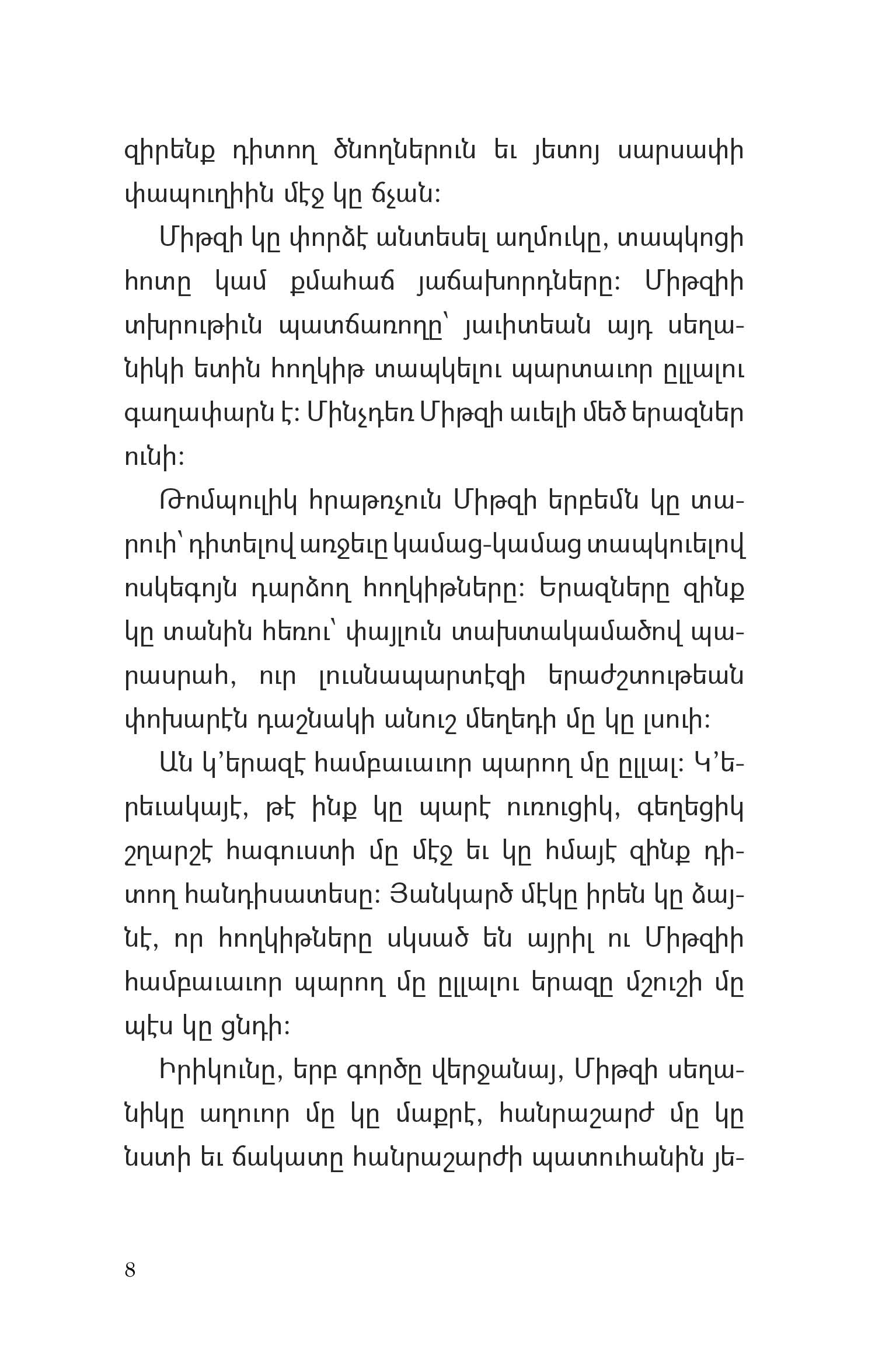 «Միթզի ‑ Պարող Հրաթռչունը» հեքիաթը, ուր Զէյնէպ Ալփասլան մտերմիկ լեզուով մը կը պատմէ ինքզինք ճանչնալը, ինքն իրեն հաւատալը եւ երազները հետապնդելու գեղեցկութիւնը, ուղղուած է եօթը տարեկան եւ անկէ բարձր տարիք ունեցող մանուկներուն։ Գիրքը զարդարուած է Օրհան Աթայի մէկը միւսէն գեղեցիկ նկարներով։